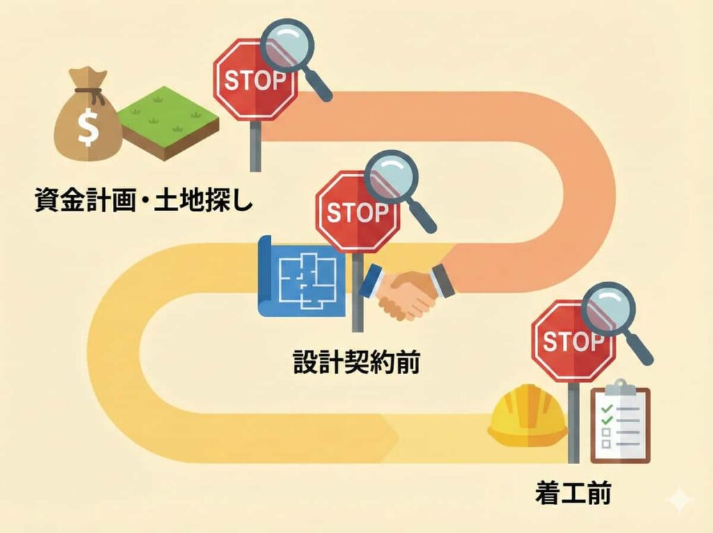 資金計画、設計契約前、着工前。この3点を押さえれば、大きな失敗は防げます。